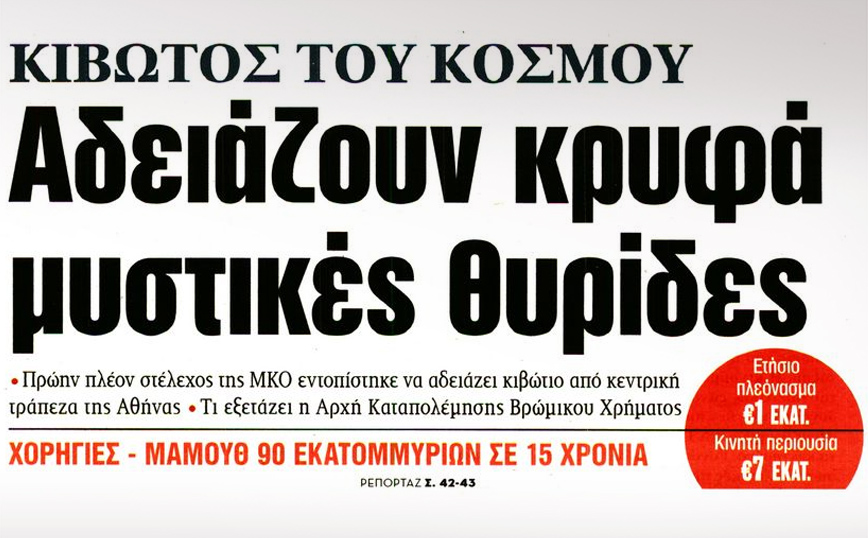Η τραπεζική θυρίδα με το άγνωστο περιεχόμενο που αφαιρέθηκε άρον-άρον προ 48 ωρών φέρεται ότι είχε ανοιχτεί στο όνομα της Κιβωτού του Κόσμου, αναφέρει το δημοσίευμα. Σύμφωνα με εκτιμήσεις το μυστικό «άδειασμα» υπήρξε τόσο λόγω της δικαστικής έρευνας, με τον κίνδυνο να αναδειχθούν στοιχεία για διαρκή κερδοσκοπία των υπευθύνων του ιδρύματος, όσο και του κινδύνου δέσμευσης και κατάσχεσης του περιεχομένου της που μπορεί να αφορούσε και «ενοχοποιητικά» στοιχεία για τους υπεύθυνους των δομών.