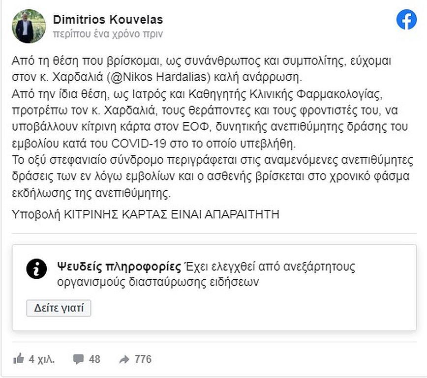 Ο καθηγητής είχε κάνει την ανάρτηση στο Facebook τον Αύγουστο του 2021 προέτρεπε μάλιστα «τον κ. Χαρδαλιά, τους θεράποντες γιατρούς και τους φροντιστές του να υποβάλουν “κίτρινη κάρτα” στον ΕΟΦ για δυνητική ανεπιθύμητη δράση του εμβολίου».