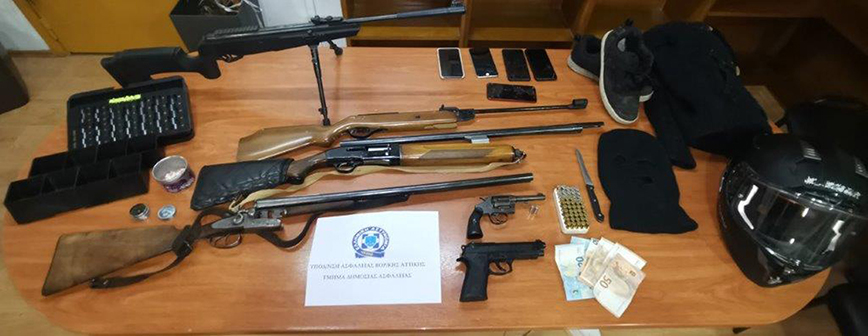 Από τις έρευνες που πραγματοποιήθηκαν κατά τη διάρκεια της επιχείρησης σε Χαλάνδρι, Μαρούσι και Αθήνα κατασχέθηκαν: περίστροφο, 2 καραμπίνες, 3 αεροβόλα όπλα, πλήθος φυσιγγίων, μαχαίρι ως μέσο τέλεσης των ληστειών, ρουχισμός που χρησιμοποιήθηκε κατά τη διάπραξη των ληστειών, μικροποσότητα κάνναβης κ.ά.
