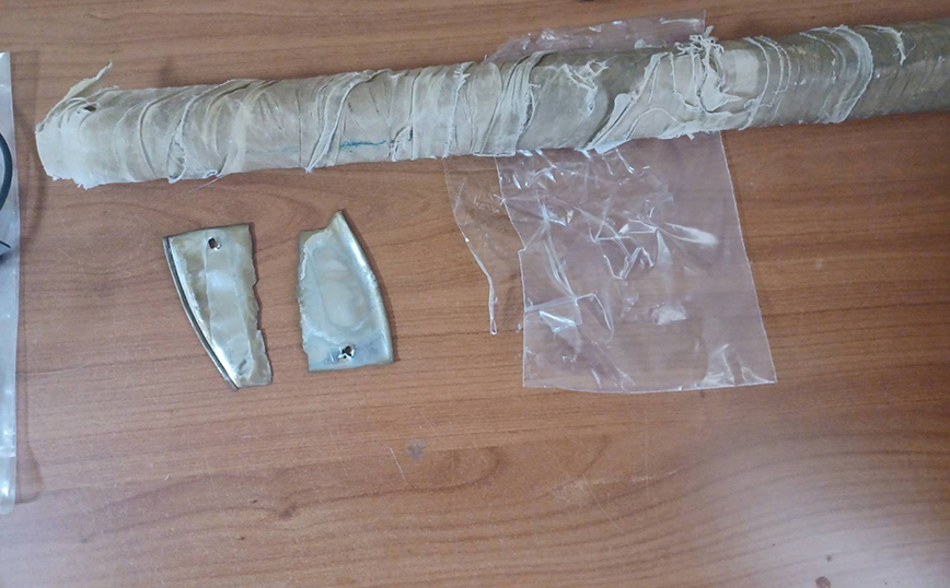 - 2 τμήματα λάμας, αυτοσχέδιο ξυράφι και ξυράφι προσαρμοσμένο σε ξύλινο καλαμάκι, κομμάτι πλεξι-γκλας και σπάτουλα μεταλλική.