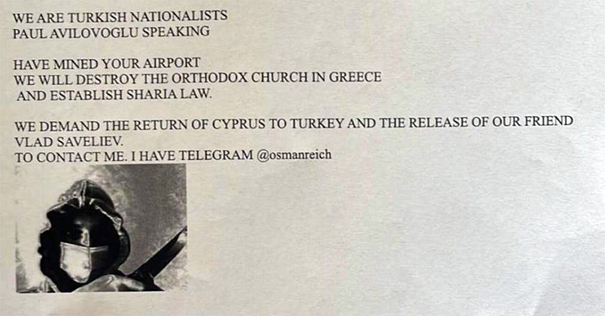 «Είμαστε Τούρκοι εθνικιστικές. Σας μιλάει ο Paul Aviloglou. Έχουμε επισημάνει όλα τα νοσοκομεία σας στην Αθήνα. Θα καταστρέψουμε την Ορθόδοξη Εκκλησία της Ελλάδος και θα καθιερώσουμε τον νόμο της “Σαρία”. Απαιτούμε την επιστροφή της Κύπρου στην Τουρκία και την απελευθέρωση και την επιστροφή του φίλου μας Vlad Saveliev. Για να επικοινωνήσετε μαζί μου, έχω λογαριασμό στο Telegram».