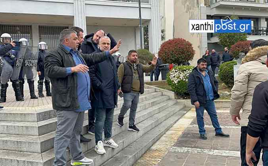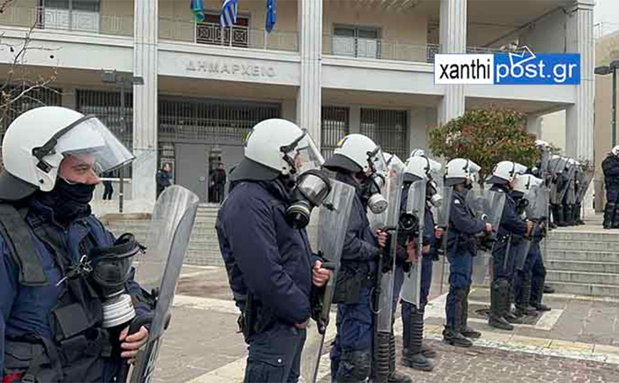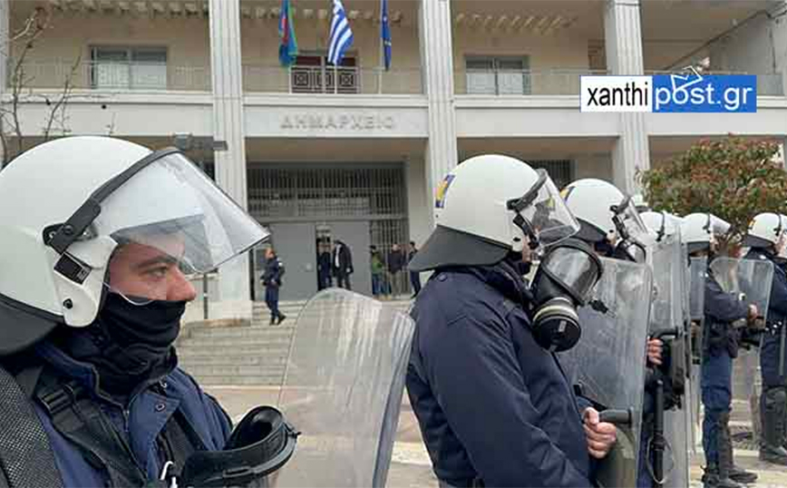 Σύμφωνα με το xanthipost.gr, μπροστά στο δημαρχείο αναπτύχθηκε ομάδα των ΜΑΤ, χωρίς, ωστόσο, να προκληθούν επεισόδια.