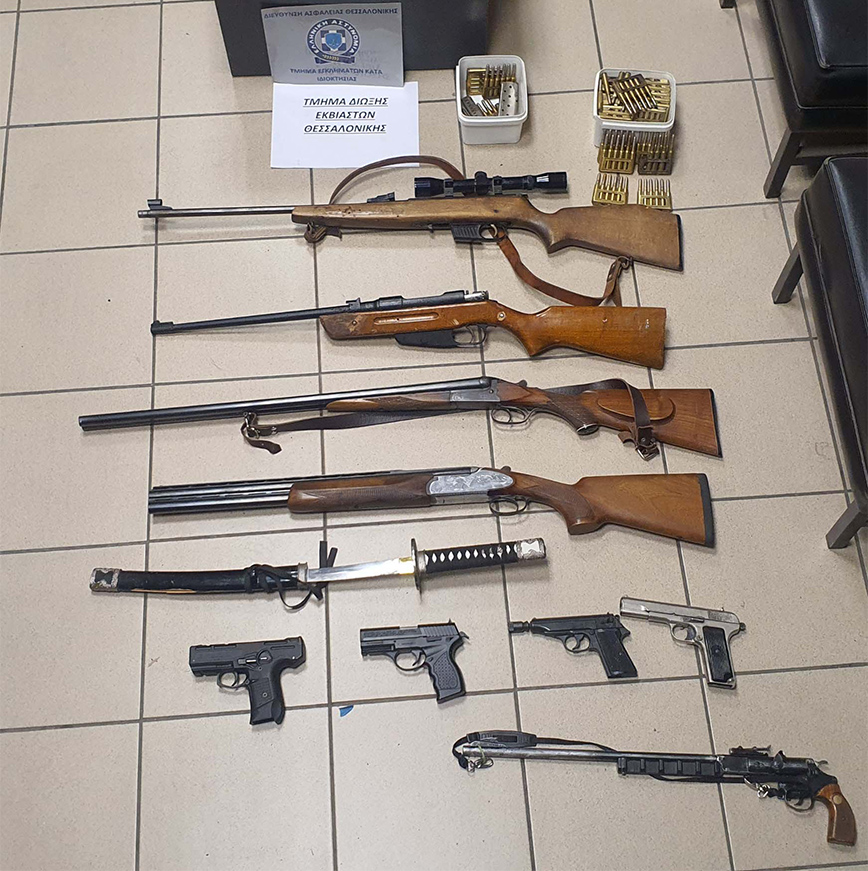 Ολόκληρο οπλοστάσιο εντόπισαν αστυνομικοί του Τμήματος Δίωξης Εκβιαστών της Διεύθυνσης Ασφάλειας Θεσσαλονίκης σε οργανωμένη επιχείρηση σε περιοχές του νομού Πέλλας, μετά από πληροφοροίες που αφορούσαν σε παράνομη κατοχή όπλων, πυρομαχικών, εκρηκτικών υλών και τυποποιημένου στρατιωτικού – πολεμικού υλικού. Συνελήφθησαν δύο άτομα ηλικίας 56 και 63 ετών.