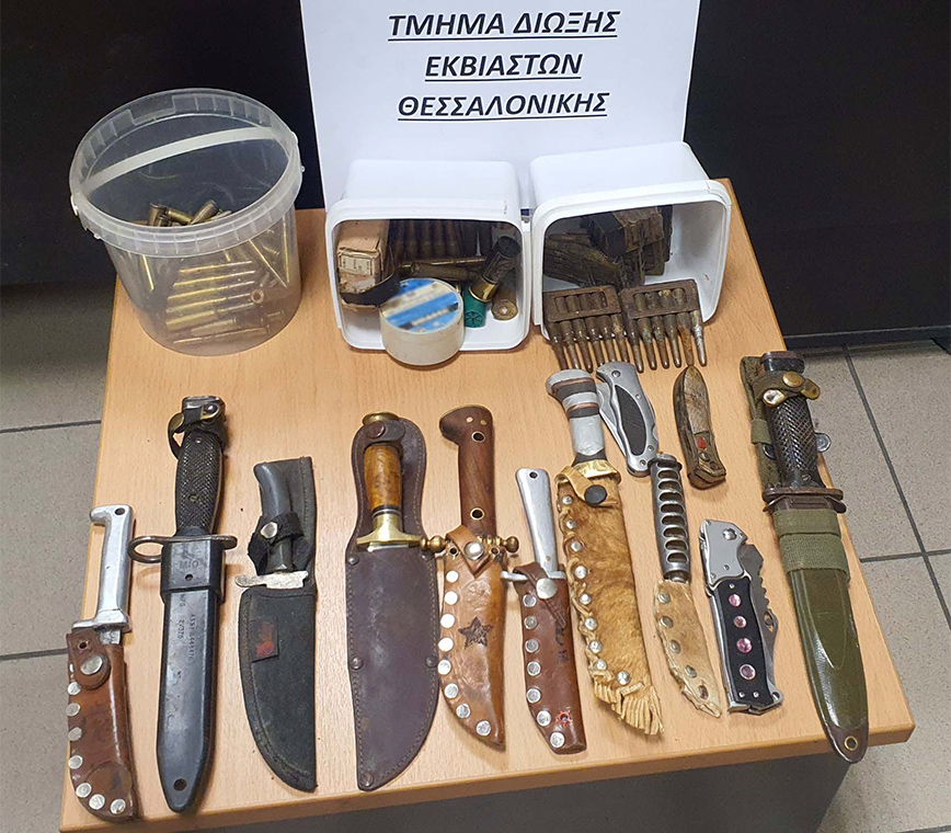 Στη συνέχεια εντοπίστηκε ο 63χρονος, ο οποίος σε αποθηκευτικούς χώρους του σπιτιού του έκρυβε έντεκα μαχαίρια, εκ των οποίων το ένα αναδιπλούμενο, δώδεκα κοινούς πυροκροτητές, τρία κυλινδρικά φιαλίδια που περιείχαν εννέα κοινούς πυροκροτητές, ένα βραδύκαυστο πυραγωγό σχοινίο, πλήθος δοχείων, φιαλιδίων, μικροδεμάτων που περιείχαν ποσότητες άγνωστων μειγμάτων, που θα αποσταλούν για περαιτέρω εξέταση, επτά κάνες μακρύκανου όπλου, φυσίγγια, γεμιστήρες, πιστόλι κρότου, βολίδες πυροβόλου όπλου κ.ά.