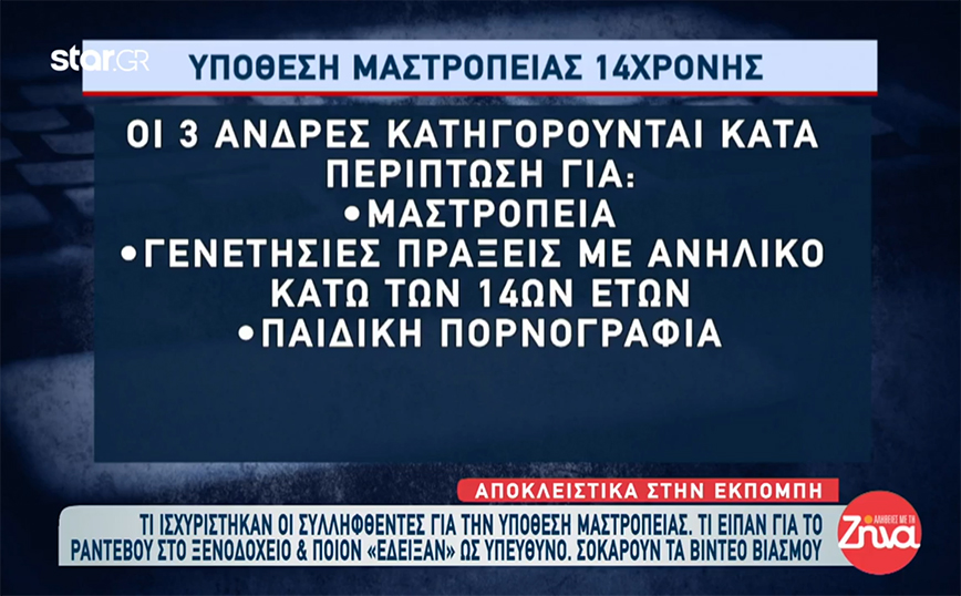 Ποινική δίωξη σε βαθμό κακουργήματος έχει ασκηθεί σε βάρος των τριών ανδρών που φέρονται να εξέδιδαν και να κακοποιούσαν σεξουαλικά την 14χρονη μαθήτρια που φιλοξενούταν σε ίδρυμα της Νέας Σμύρνης. Συγκεκριμένα, οι τρεις άνδρες κατηγορούνται για τα αδικήματα της μαστροπείας, των γενετήσιων πράξεων με ανήλικο κάτω των 14 ετών και της παιδικής πορνογραφίας. Μετά την άσκηση της ποινικής δίωξης πήραν προθεσμία να απολογηθούν την Παρασκευή.