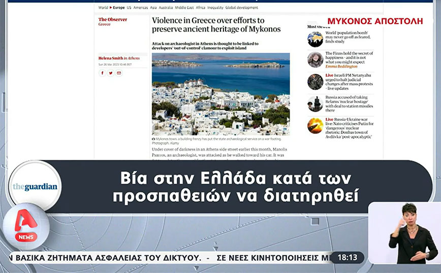 Με τις μαφιόζικες πρακτικές στη Μύκονο ασχολήθηκε και ο βρετανικός Guardian σε εκτενές του άρθρο με τίτλο «Βία στην Ελλάδα κατά των προσπαθειών να διατηρηθεί η αρχαία κληρονομιά στη Μύκονο».