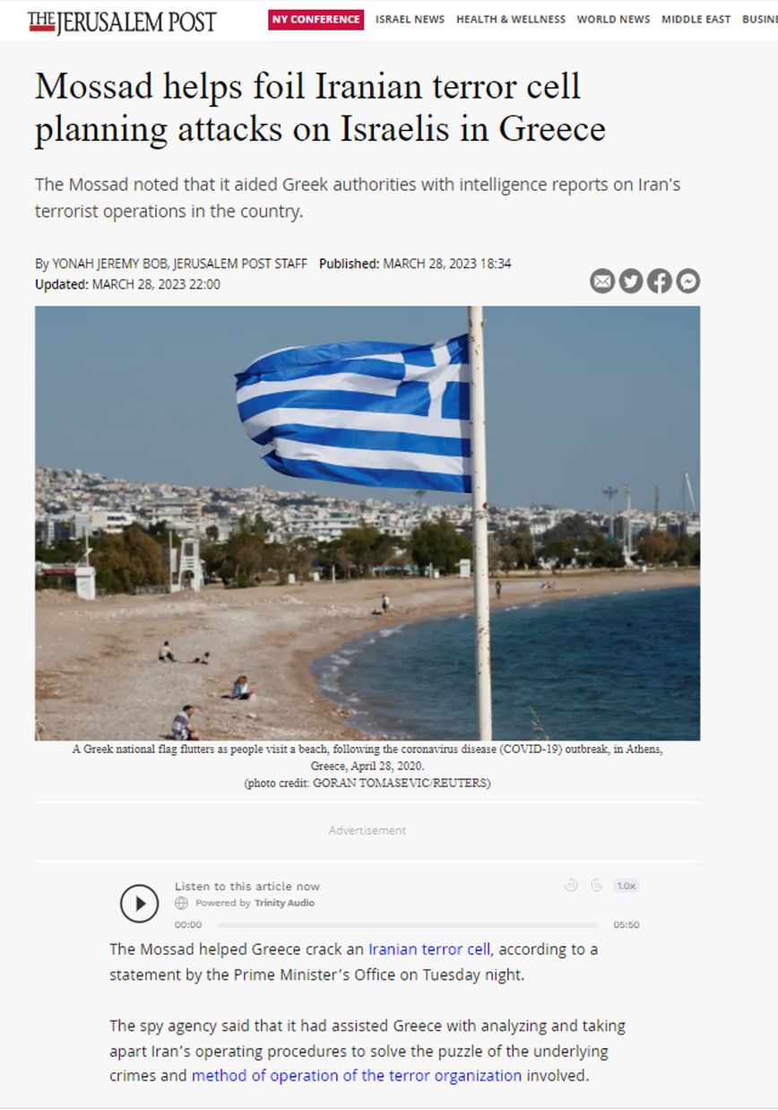 Από το Γραφείο Τύπου του πρωθυπουργού του Ισραήλ, Μπενιαμίν Νετανιάχου βγήκε ανακοίνωση για την εξάρθρωση των τρομοκρατών από τις ελληνικές αρχές. «Η υπόθεση που αποκαλύφθηκε σήμερα στην Ελλάδα είναι μια σοβαρή υπόθεση που απετράπη με επιτυχία από τις ελληνικές δυνάμεις ασφαλείας. Ήταν μια πρόσθετη προσπάθεια του Ιράν να διαπράξει τρομοκρατία εναντίον ισραηλινών και εβραϊκών στόχων στο εξωτερικό. Μετά την έναρξη της έρευνας των υπόπτων στην Ελλάδα, η Μοσάντ παρείχε βοήθεια πληροφοριών για την αποκάλυψη της υποδομής, των μεθόδων εργασίας της και της σύνδεσης με το Ιράν. αποκάλυψε ότι η υποδομή που λειτουργούσε στην Ελλάδα αποτελεί μέρος ενός εκτεταμένου ιρανικού δικτύου που προέρχεται από το Ιράν και εκτείνεται σε πολλές χώρες. Η Μοσάντ, μαζί με τους εταίρους της στην κοινότητα, εργάζεται ακατάπαυστα για να αποτρέψει τις επιδιωκόμενες ιρανικές επιθέσεις σε όλο τον κόσμο».