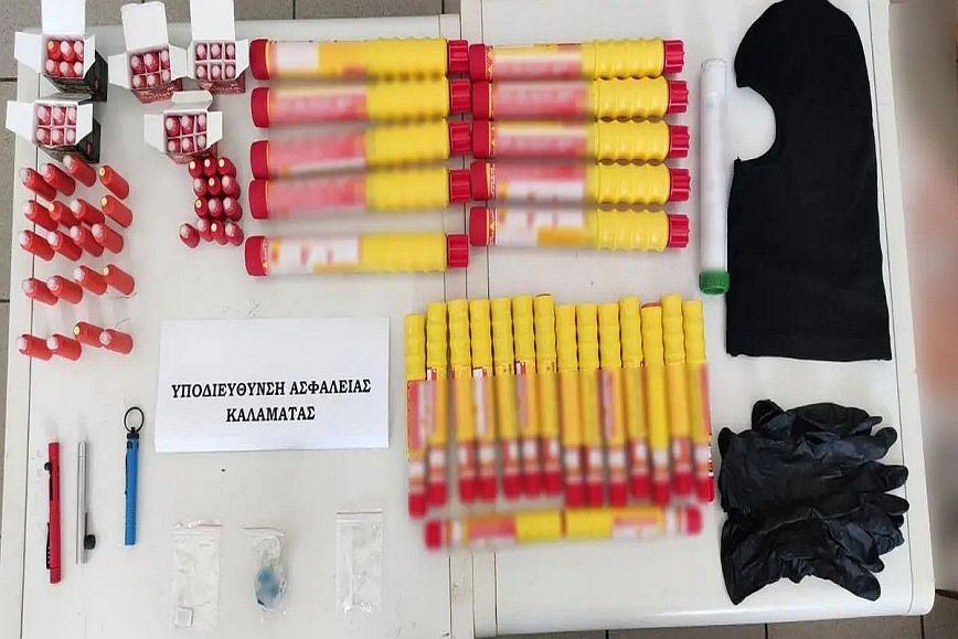 Τα άτομα, μόλις αντιλήφθηκαν αστυνομική παρουσία στα Διόδια Αρφανών και λίγο πριν διενεργηθεί ο έλεγχος, απέρριψαν στο πρανές του αυτοκινητοδρόμου 89 φωτοβολίδες – κροτίδες, πυρσό, 3 αυτοσχέδια πιστόλια εκτόξευσης φωτοβολίδων (τύπου στυλό), 3.6 γραμμάρια ακατέργαστης κάνναβης, 0.4 γραμμάρια κοκαΐνης και 1 δισκίο xanax.