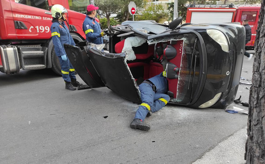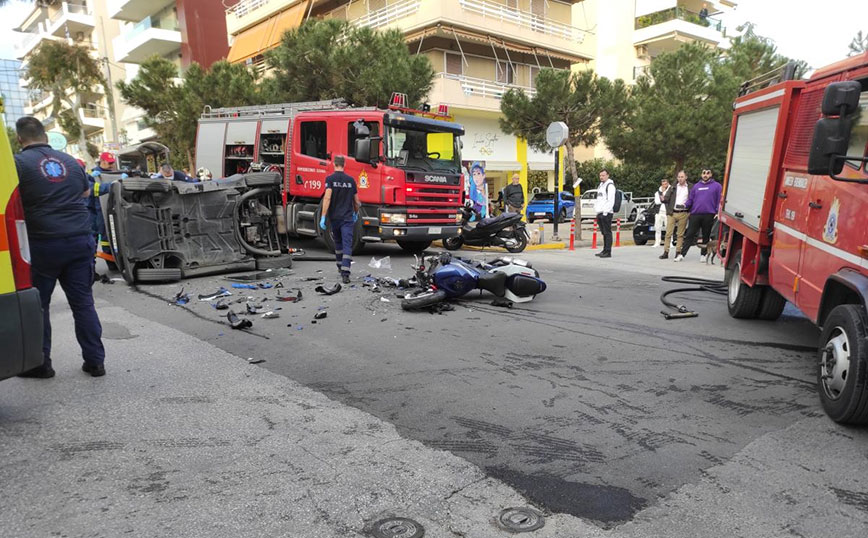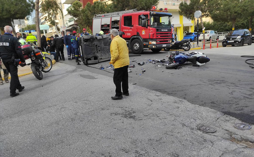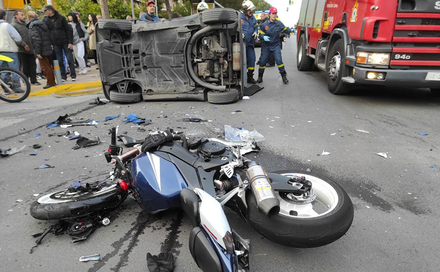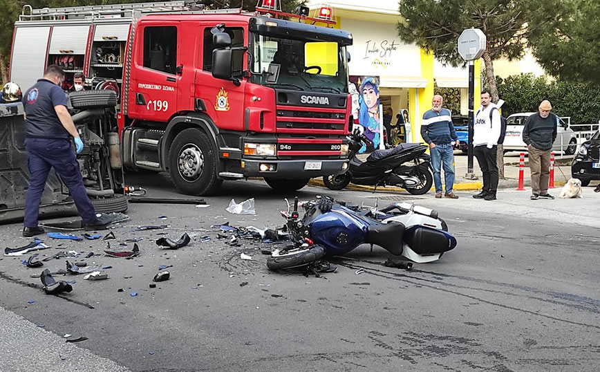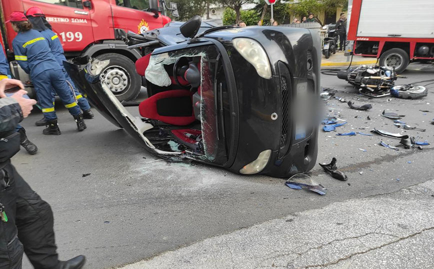 Ο οδηγός της μηχανής εκτινάχτηκε και κατέληξε μέσα στην καμπίνα του αυτοκινήτου το οποίο τούμπαρε. Στο σημείο έσπευσαν ασθενοφόρα και οχήματα της Πυροσβεστικής.