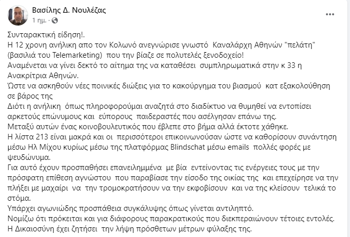 Αναλυτικά η ανάρτηση του Βασίλη Νουλέζα: «Συνταρακτική είδηση! Η 12χρονη ανήλικη από τον Κολωνό ανεγνώρισε γνωστό Καναλάρχη Αθηνών “πελάτη” (βασιλιά του Telemarketing) που την βίαζε σε πολυτελές ξενοδοχείο!