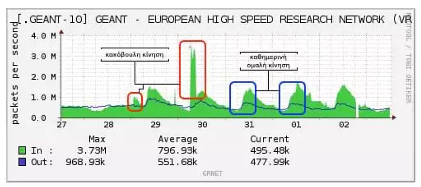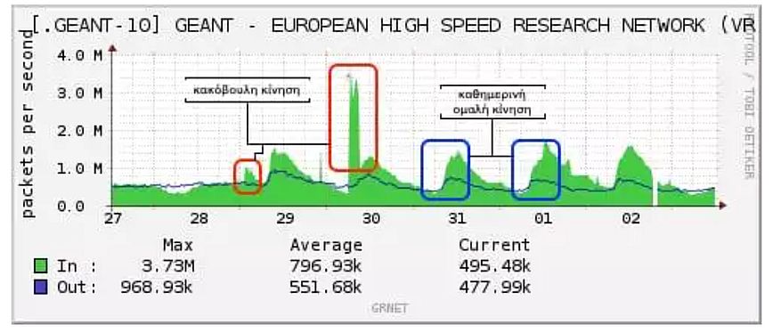 Διευκρινίσεις σε σχέση με την νόμιμη δικτυακή κίνηση:Ο ρυθμός 280 χιλ. πακέτων ανά δευτερόλεπτο που αναφέρεται για την Δευτέρα 29/5 αντιστοιχεί σε περίπου 17 εκ. συνδέσεις ανά λεπτό ή 1 δις ανά ώρα. Την Τρίτη 30/5 οι αντίστοιχοι ρυθμοί επεξεργασίας δικτυακών πακέτων όπως φαίνεται ενδεικτικά από τα παραπάνω γραφήματα είναι 300 εκ. ανά λεπτό ή 18 δις ανά ώρα. Οι ρυθμοί αυτοί υπερβαίνουν κατά πολύ τις λογικές απαιτήσεις για τη νόμιμη κίνηση των εμπλεκόμενων εφαρμογών στις επιθέσεις αυτές. Σχόλια που προτείνουν υπερδιαστασιολόγηση συστημάτων ως τρόπο αντιμετώπισης επιθέσεων DDoS, ή συγκρίνουν μεταξύ τους εφαρμογές με διαφορετικές προδιαγραφές τα θεωρούμε απρόσεκτα και παραπλανητικά, ειδικά όταν προέρχονται από εκπροσώπους του τομέα της πληροφορικής και επικοινωνιών.