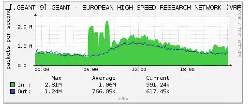 Εικόνα 2: Ρυθμός επεξεργασίας δικτυακών πακέτων εισερχόμενων από το Internet, ανά δευτερόλεπτο στον δρομολογητή του κόμβου «ΚΩΛΕΤΤΗ» του ΕΔΥΤΕ στις 30/5/2023.