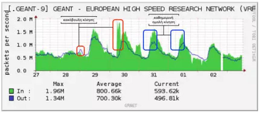 Εικόνα 1:Ρυθμός επεξεργασίας δικτυακών πακέτων εισερχόμενων από το Internet, ανά δευτερόλεπτο στον δρομολογητή του κόμβου «ΕΙΕ» του ΕΔΥΤΕ στις 30/5/2023.