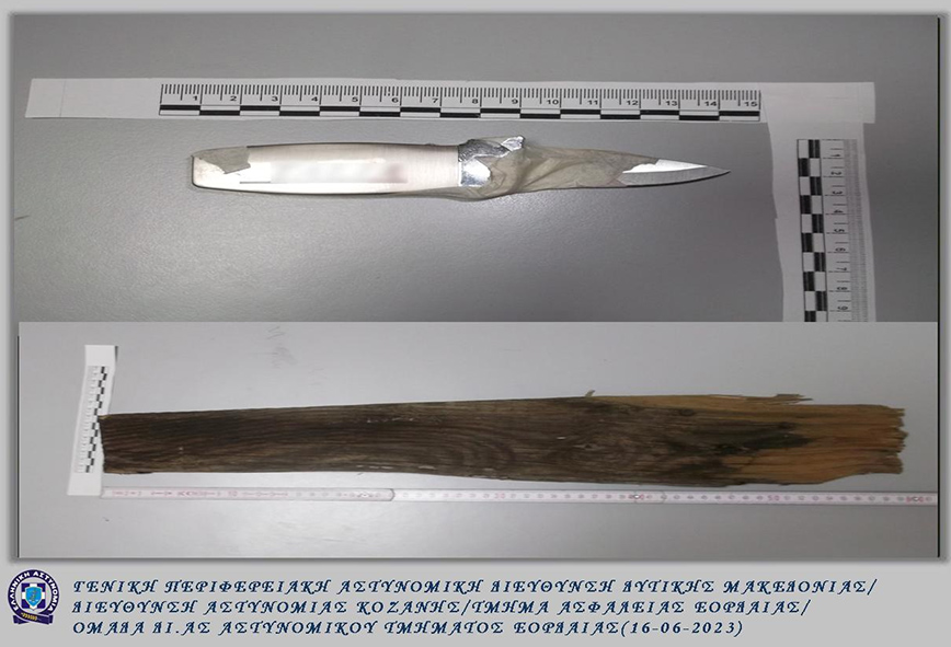 Οι αστυνομικοί βρήκαν και κατέσχεσαν το αιχμηρό αντικείμενο και το κομμάτι ξύλου, με τα οποία οι δράστες επιτέθηκαν στο θύμα τους.