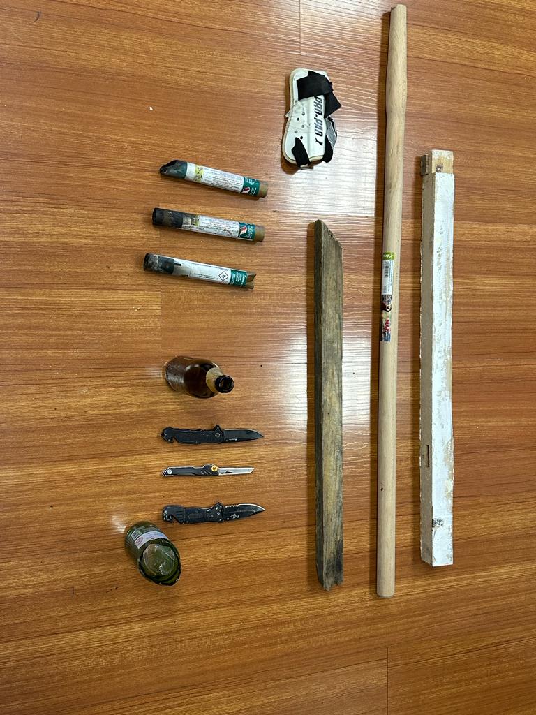 Μεταξύ άλλων, όπως φαίνεται στις φωτογραφίες που εξασφάλισε το Newsbeast, βρέθηκαν φωτοβολίδες, σουγιάδες, μαχαίρια, στυλιάρια, ξύλινη ταύλα με προσαρμοσμένα καρφιά, φουλ face, γάντια με ενίσχυση, επικαλαμίδες κ.α.