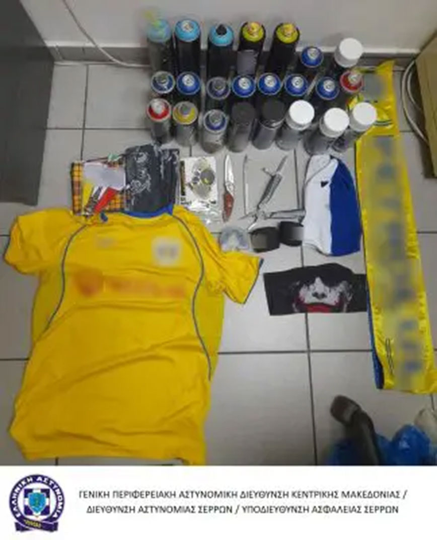 Ειδικότερα, σε αστυνομικό έλεγχο του οχήματος στο οποίο επέβαιναν κατά την είσοδό τους στη χώρα βρέθηκαν στην κατοχή τους και κατασχέθηκαν: δύο μαχαίρια, ένα πολυεργαλείο με μαχαίρι, 23 σπρέι βαφής, μία μάσκα τύπου full face, εξοπλισμός πυγμαχίας (περικάρπια, μασελάκι) και φανέλα, κασκόλ και άλλα αντικείμενα που έφεραν τα διακριτικά αθλητικού συλλόγου της αλλοδαπής.