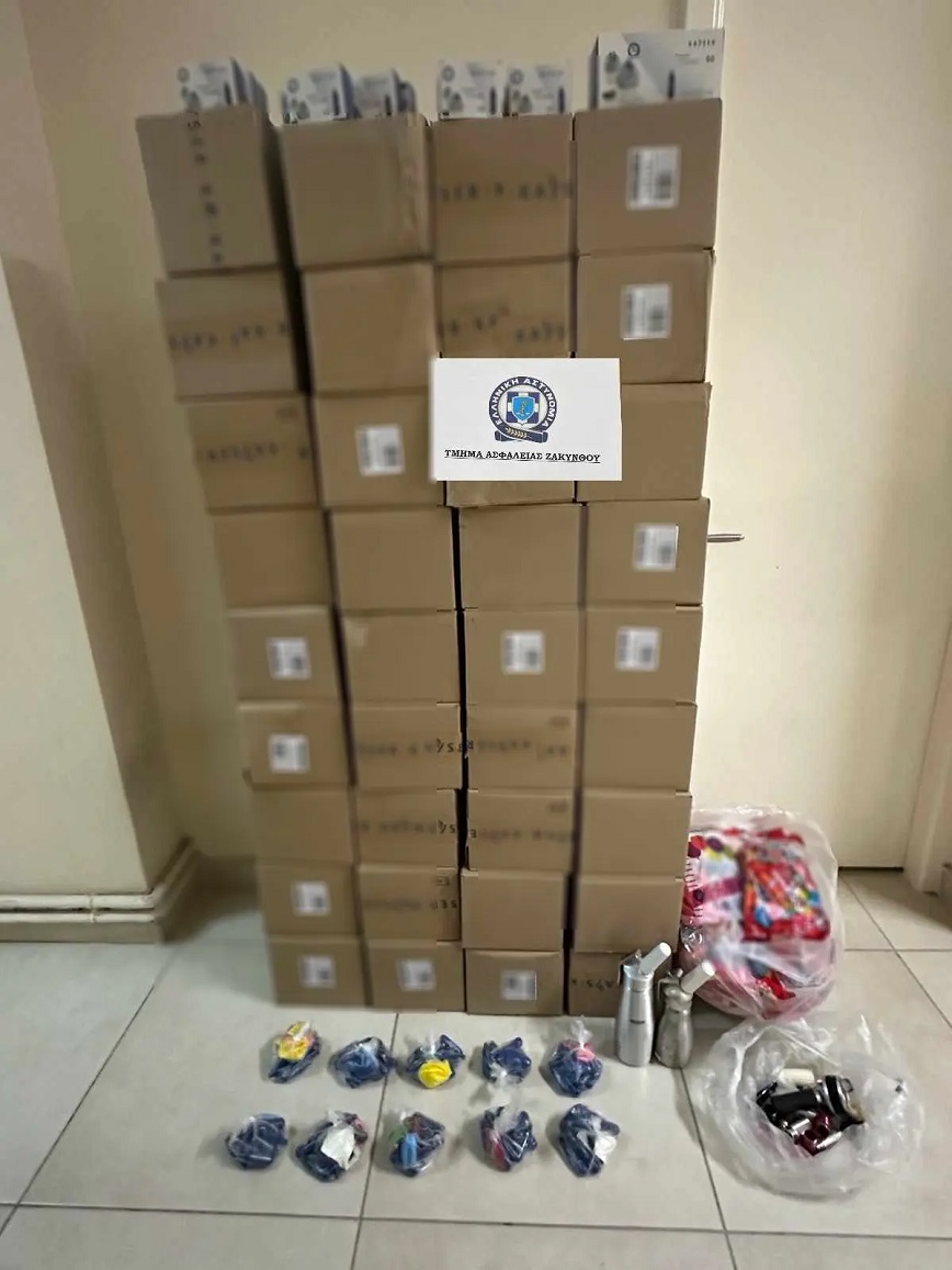 Κατά τις έρευνες, τόσο στον χώρο υποδοχής, σε ένα ράφι, όσο και σε αποθήκη πίσω από τη ρεσεψιόν, βρέθηκαν συνολικά και κατασχέθηκαν 20.160 αμπούλες αερίου γέλιου, πλήθος από μπαλόνια, καθώς και 2 συσκευές εκτόνωσης αμπουλών.