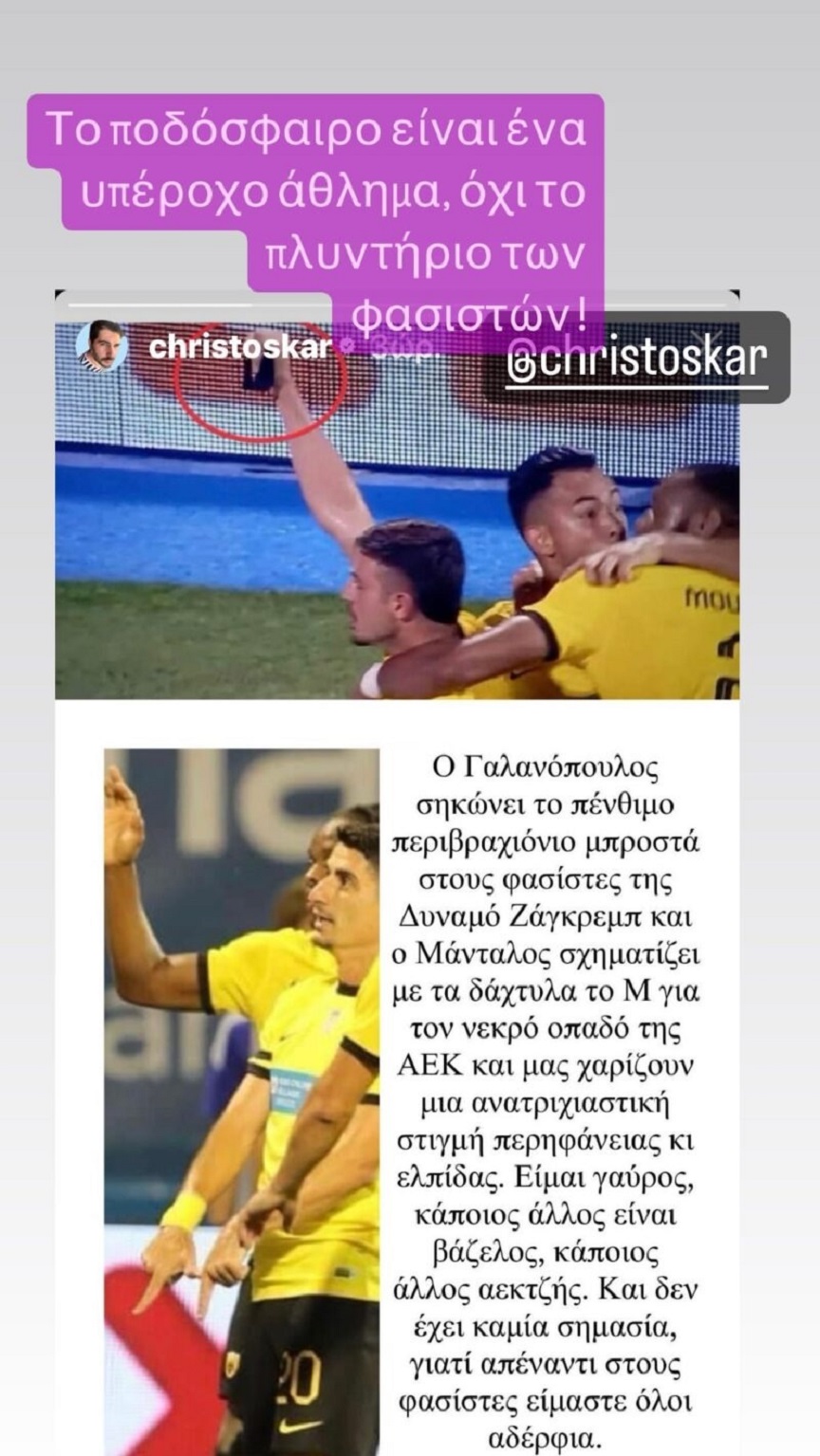 Σε αυτά τα δύο στιγμιότυπα των κιτρινόμαυρων παικτών στάθηκε η Μαριάννα Τουμασάτου. Η ηθοποιός μέσα από ανάρτησή της στο Instagram θέλησε να τονίσει την ομορφιά του αθλήματος και την «ασχήμια» του φασισμού.