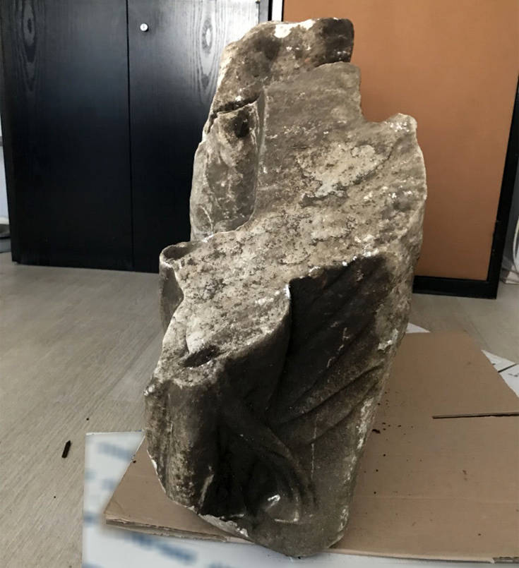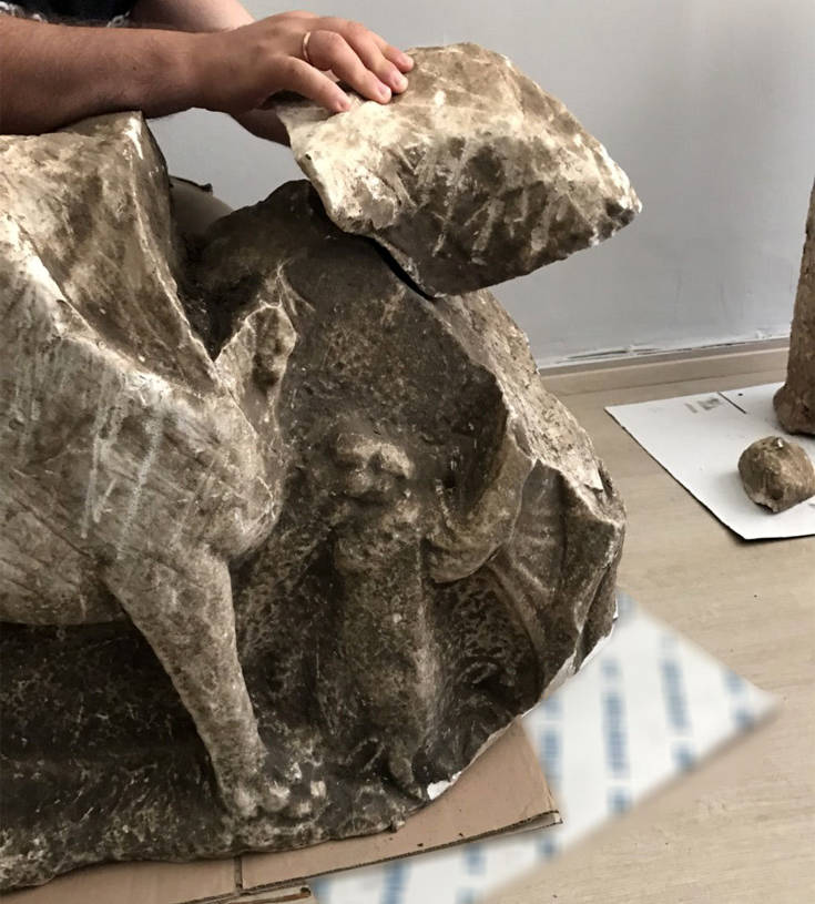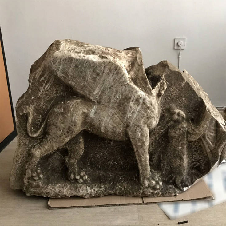 - Τμήμα από την στενή πλευρά μαρμάρινης ανάγλυφης σαρκοφάγου με παράσταση μυθολογικού όντος, με σώμα λιονταριού και φτερά πουλιού (πιθανόν γρύπας), του οποίου δεν σώζεται η κεφαλή (σωζόμενου πλάτους 90 εκατοστών, σωζόμενου ύψους 66 εκατοστών και πάχους 20 εκατοστών), η οποία χρονολογείται κατά τη ρωμαϊκή περίοδο και πιο συγκεκριμένα μεταξύ του 2ου και 3ου αιώνα μ.Χ.,