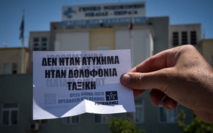 Περίπου δέκα μέλη του Ρουβίκωνα έκαναν σήμερα (03.07.2019) «ντου» στο Γενικό Κρατικό Νίκαιας για να διαμαρτυρηθούν για τον θάνατο της νοσοκόμας, πετώντας κρικάκια και φέιγ βολάν που έγραφαν: «Δουλέμποροι και αφεντικά το ίδιο μαγαζί» και «Δεν ήταν ατύχημα, ήταν δολοφονία ταξική».