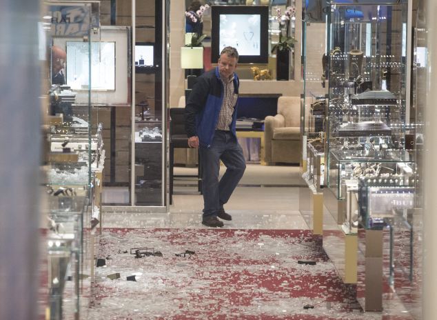 Οι ληστές ήταν μεταμφιεσμένοι σε γυναίκες και φορούσαν μπούρκες. Αφού έσπασαν τις προθήκες των ρολογιών και των κοσμημάτων με τα τσεκούρια, άρπαξαν ό,τι μπορούσαν και προσπάθησαν να διαφύγουν με μηχανάκια που οδηγούσαν συνεργοί τους. Μέχρι στιγμής δεν έχει διευκρινιστεί η αξία των ρολογιών που κλάπηκαν.
