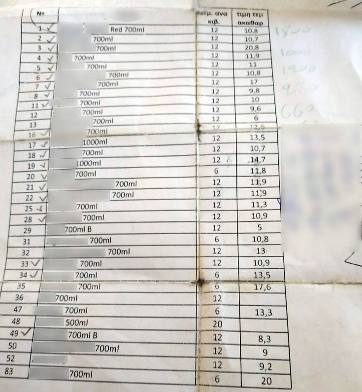 Στο πλαίσιο της επιχείρησης κατασχέθηκαν πάνω από ένας τόνος αιθυλικής αλκοόλης, περισσότερες από 28.000 φιάλες αλκοολούχων ποτών, 7.100 πλαστές ετικέτες διάφορων εμπορικών οίκων αλκοολούχων ποτών, ποσότητες ποτών (690 λίτρα ούζο, 300 λίτρα κονιάκ και 110 λίτρα μαστίχα), καθώς και πλήρης εξοπλισμός νόθευσης ποτών, ειδικότερα πλήθος από φιάλες βενζίνης, κόλλες, παλέτες, ανυψωτικά μηχανήματα κ.λπ. Επίσης, κατασχέθηκαν τέσσερα Ι.Χ. αυτοκίνητα, δύο μοτοσικλέτες, καθώς και 32.330 ευρώ.