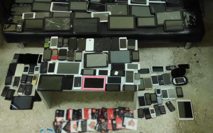 Στις έρευνες που πραγματοποιήθηκαν βρέθηκαν και κατασχέθηκαν: 169 κινητά τηλέφωνα, 53 ηλεκτρονικές συσκευές tablet, 228 εξαρτήματα κινητών τηλεφώνων, 16 μαχαίρια, πτυσσόμενα στιλέτα και σουγιάδες, 115 κάρτες SIM,χρηματικό ποσό 1.790 ευρώ, 2 τηλεοράσεις και πλήθος κοσμημάτων.