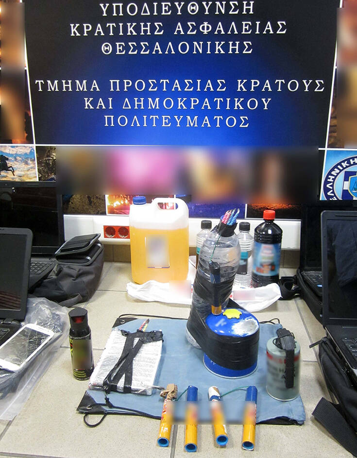 Βάσει της ανακοίνωσης από την ΕΛ.ΑΣ., κατά τις επιτόπιες έρευνες κατασχέθηκαν τέσσερις πυροτεχνικές συσκευές, μία χειροβομβίδα-δακρυγόνο, μία σφεντόνα και τρία μεταλλικά μπουλόνια, πλαστικές φιάλες με εύφλεκτο υλικό, ένα πτυσσόμενο μαχαίρι, σπρέι πιπεριού, ποσότητες κάνναβης , όπως επίσης φορητοί ηλεκτρονικοί υπολογιστές, φορητές μονάδες αποθήκευσης δεδομένων (usb), κινητά τηλέφωνα και φωτογραφικές μηχανές, το περιεχόμενο των οποίων εξετάζεται.