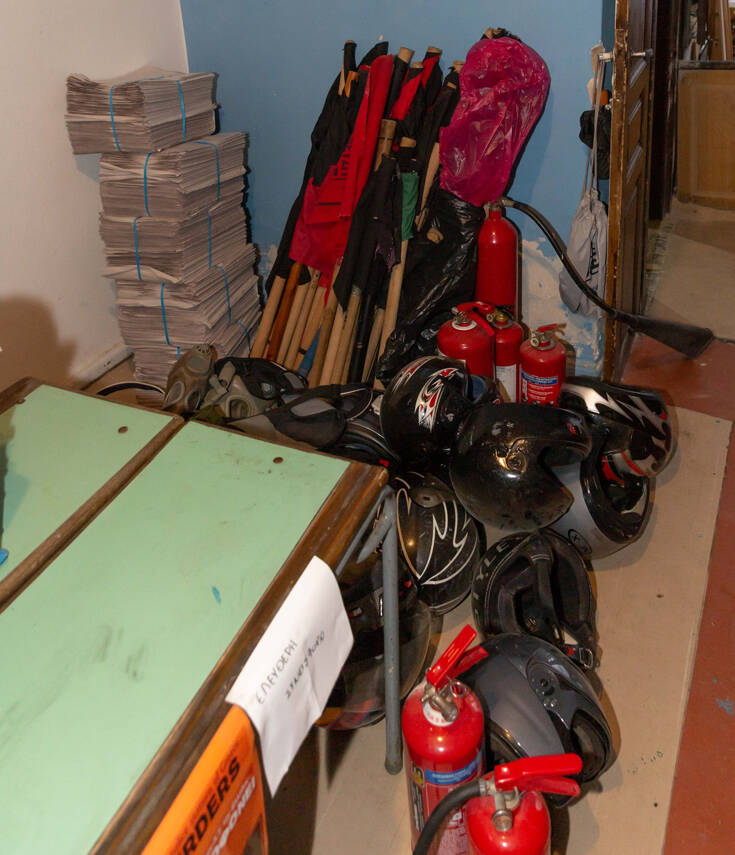 Κατά τη διάρκεια της έρευνας εντός των κτηρίων και σύμφωνα με όσα ανακοίνωσε η ΕΛ.ΑΣ. Εντός τους βρέθηκαν και κατασχέθηκαν κράνη, αντιασφυξιογόνες μάσκες, πυροσβεστήρες, στειλιάρια, ηλεκτρονικός υπολογιστής και έντυπο υλικό.