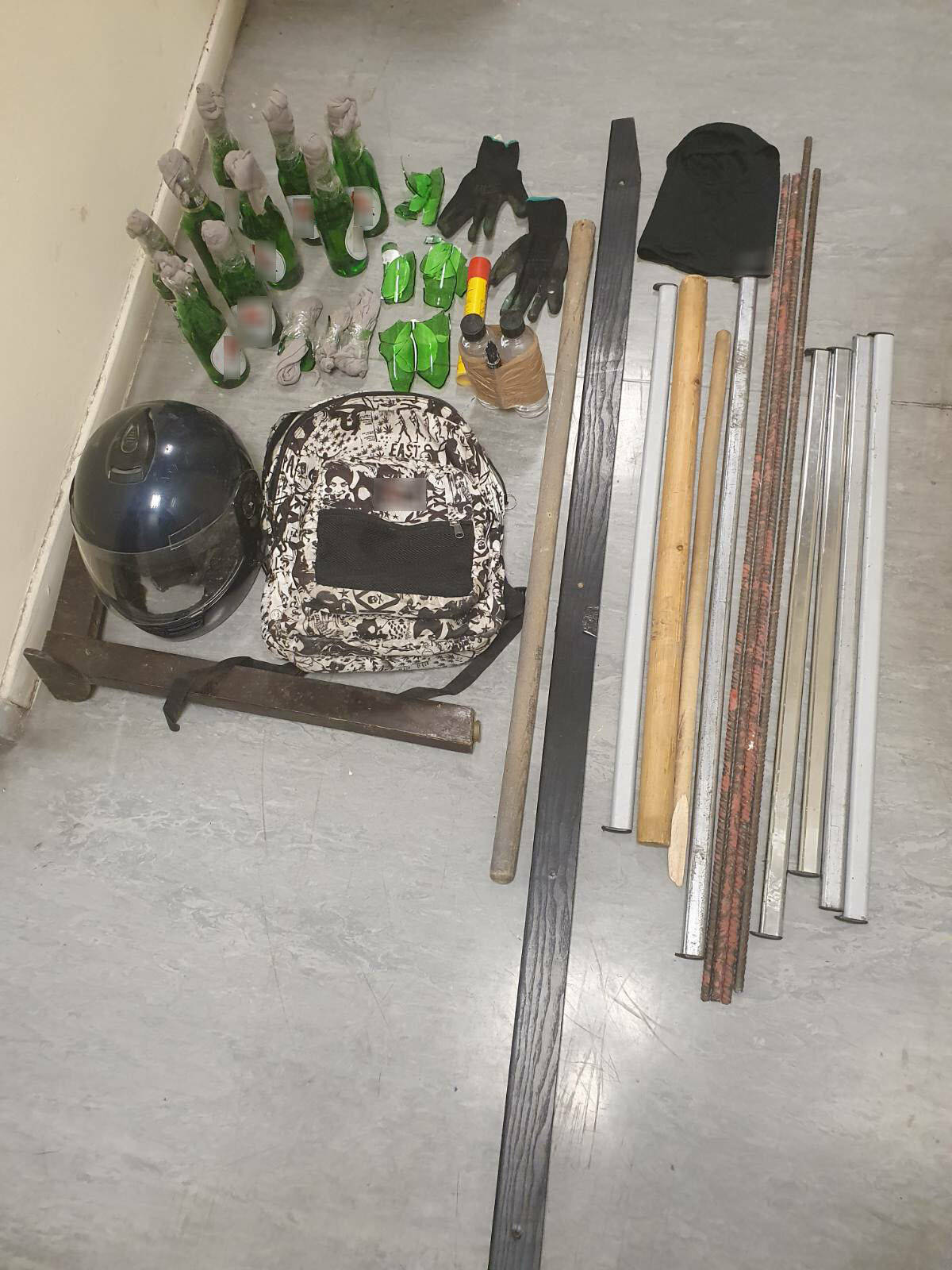 Επιπλέον, συνελήφθη ένας 20χρονος, στην κατοχή του οποίου βρέθηκαν και κατασχέθηκαν κράνος, στειλιάρι, μεταλλική ράβδος και γυάλινο μπουκάλι.