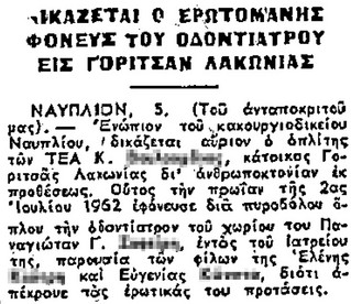 Ήταν λίγο πριν τις 11 το πρωί, της 3ης Ιουλίου 1962, όταν ο 26χρονος οπλίτης των ΤΕΑ, Κ. Β. έφυγε από το σπίτι του στη Σπάρτη με προορισμό το οδοντιατρείο της Π.Ζ., όπου είχε ένα ακόμη ραντεβού για θεραπεία των δοντιών του. Στον ώμο του είχε κρεμασμένο το υπηρεσιακό του όπλο και στα χέρια του κρατούσε μια δέσμη φυσιγγίων.