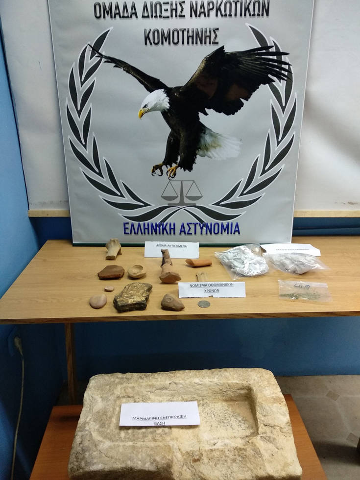 Συνελήφθη χθες (26-11-2018) το πρωί, σε οικισμό της Ροδόπης, από αστυνομικούς της Ομάδας Δίωξης Ναρκωτικών του Τμήματος Ασφάλειας Κομοτηνής, 54χρονος ημεδαπός, σε βάρος του οποίου σχηματίσθηκε δικογραφία για παραβάσεις των νόμων περί προστασίας των αρχαιοτήτων και εν γένει της πολιτιστικής κληρονομιάς και περί ναρκωτικών.