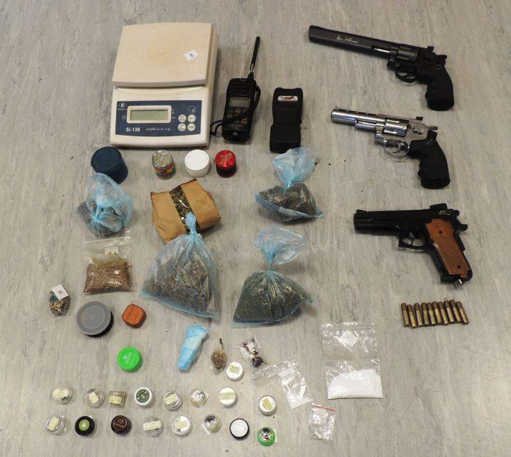 Κατασχέθηκαν μεταξύ άλλων 160,7 γραμμάρια κάνναβης, 0,9 γραμμάρια κοκαΐνης, 3 αεροβόλα όπλα, taser, ασύρματος και ηλεκτρονική ζυγαριά ακριβείας