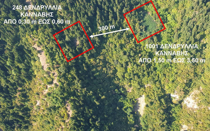 Όσον αφορά στις 2 φυτείες, εκ των οποίων η μία αποτελούμενη από 1.001 δενδρύλλια κάνναβης, ύψους έως 3,5 μέτρα και η άλλη αποτελούμενη από 248 δενδρύλλια κάνναβης, ύψους έως 0,60 εκατοστά, αυτές βρίσκονταν σε κοντινή απόσταση μεταξύ τους (τριακόσια μέτρα), ενώ συνδέονταν μέσω ενός αυτοσχέδιου μονοπατιού, που είχε δημιουργηθεί από μέλη της εγκληματικής ομάδας.