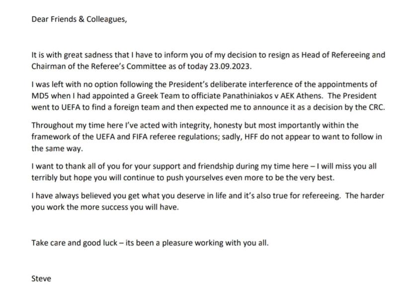 Στην επιστολή του, όπως αυτή δημοσιεύτηκε στην ιστοσελίδα SDNA, ο Άγγλος αρχιδιαιτητής κάνει λόγο για σκόπιμη παρέμβαση του προέδρου της ΕΠΟ, Τάκη Μπαλτάκου, κάτι το οποίο δεν μπορούσε να δεχτεί.