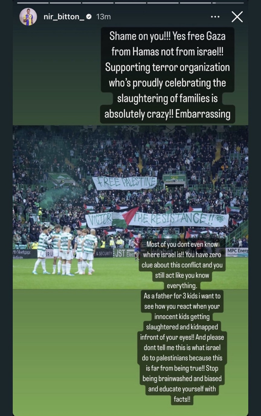 Στη νίκη της Σέλτικ με την Κιλμάρνοκ με σκορ 3-1 για το πρωτάθλημα Σκωτίας το Σάββατο (7/10) στο «Σέλτικ Παρκ», οι οπαδοί των γηπεδούχων σήκωσαν πανό υπέρ της Παλαιστίνης. Αυτή η στάση τους με τις μάχες στην Λωρίδα της Γάζας να μαίνονται, οδήγησαν σε ξέσπασμα τον Ισραηλινό διεθνή αμυντικό Νιρ Μπίτον, που για εννιά χρόνια έπαιξε για το κλαμπ.