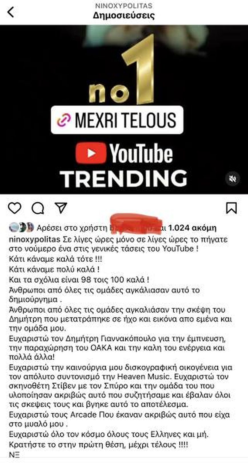 Άμεσα έγινε επιτυχία το νέο τραγούδι του Νίνο με τίτλο «Μέχρι Τέλους», που του είχε ζητήσει ο Δημήτρης Γιαννακόπουλος, καθώς μέσα σε διάστημα λίγων ωρών ανέβηκε στην πρώτη θέση των τάσεων στο YouTube.