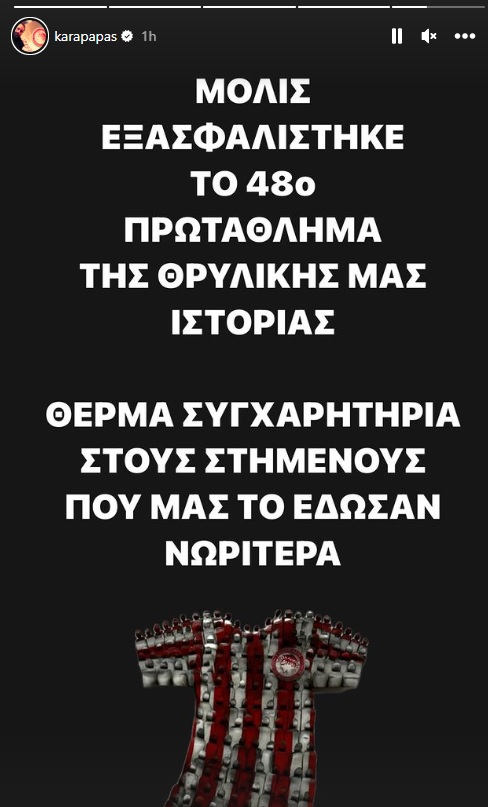 Με ανάρτησή του στο Instagram ο Κώστας Καραπαπάς ανέφερε: «Μόλις εξασφαλίστηκε το 48ο πρωτάθλημα της θρυλικής μας ιστορίας. Θερμά συγχαρητήρια στους στημένους που μας το έδωσαν νωρίτερα».