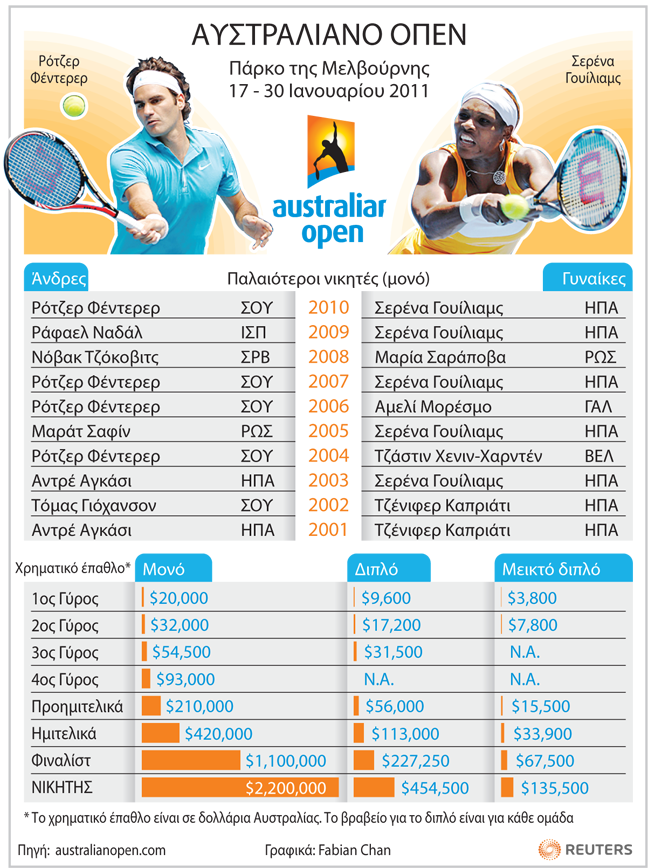 Την «αφρόκρεμα» του αντρικού και γυναικείου τένις θα φιλοξενήσει από τις 17 ως τις 30 Ιανουαρίου η Μελβούρνη. Ο τέσσερις φορές νικητής Ρότζερ Φέντερερ και η πεντάκις νικήτρια Σερένα Γουίλιαμς θα προσπαθήσουν να διατηρηθούν στο… θρόνο τους και να πανηγυρίσουν για μία ακόμη φορά την πρωτιά, στο εναρκτήριο τουρνουά γκραν σλαμ της χρονιάς.