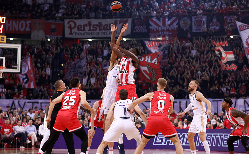 Το παιχνίδι ξεκίνησε με χαρακτηριστικό την ένταση και την ποιότητα δύο ομάδων που θαρρείς και έπαιζαν αγώνα επιβίωσης. Ο Ολυμπιακός με πλουραλισμό στην επίθεση έβρισκε λύσεις, αλλά πίσω δεν είχε τις απαραίτητες απαντήσεις για να σταματήσει το δίδυμο ψηλών της Ρεάλ (Ραβάρες, Ντιανέ) και το σκορ ήταν 10-12 (6’). Ο Καμπάτσο ήταν ασταμάτητος με ασίστ και καλάθια (12-19, 8’), ωστόσο ο Λαρεντζάκης μετά από 0/7 συνολικά τρίποντα, ευστόχησε από τα 6.75 και φρόντισε να μειωθεί η διαφορά στο 17-19 (9’).