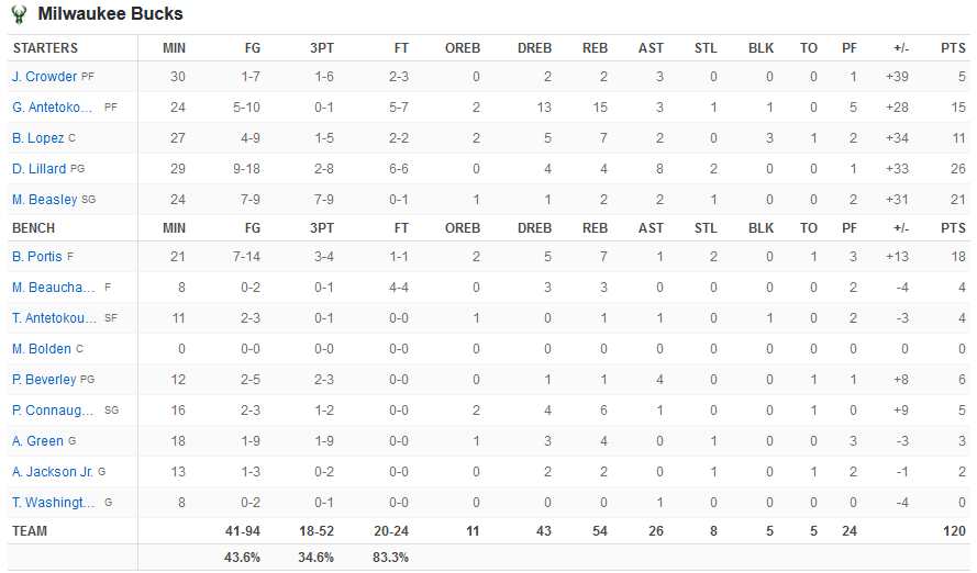 Πρώτος σκόρερ για τους νικητές ήταν ο Ντέιμιαν Λίλαρντ με 26 πόντους (7/10 δίποντα), ενώ ο Μαλίκ Μπίσλι πρόσθεσε άλλους 21 με 7/9 τρίποντα.