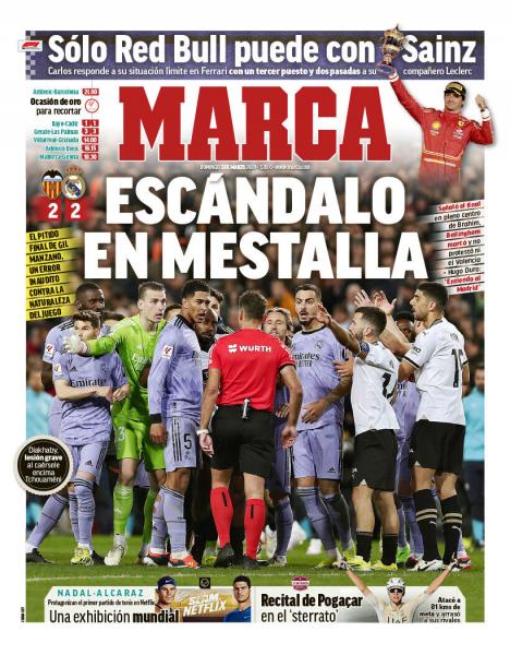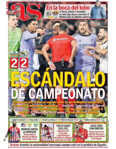 Η Ρεάλ Μαδρίτης πήρε ισοπαλία στο «Μεστάγια», παρότι βρέθηκε να χάνει με δύο γκολ από τη Βαλένθια (2-2), όμως τα φώτα στράφηκαν στο επεισοδιακό φινάλε του αγώνα, καθώς ο διαιτητής Χεσούς Χιλ Μανθάνο σφύριξε τη λήξη του την ώρα, την στιγμή που ο Μπραχίμ Ντίαζ σέντραρε για να σκοράρει ο Τζουντ Μπέλιγχαμ με κεφαλιά.