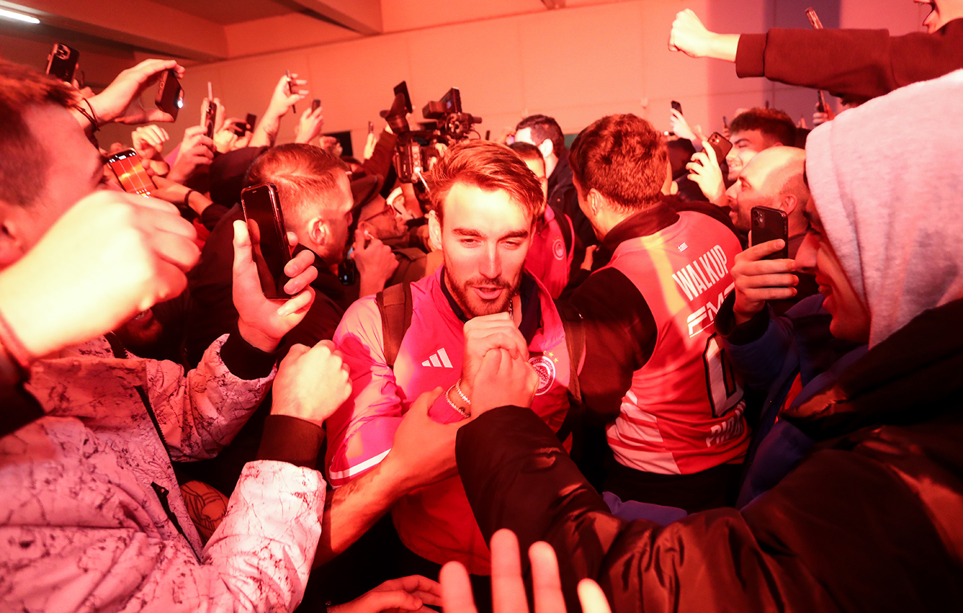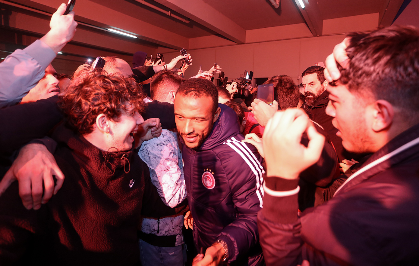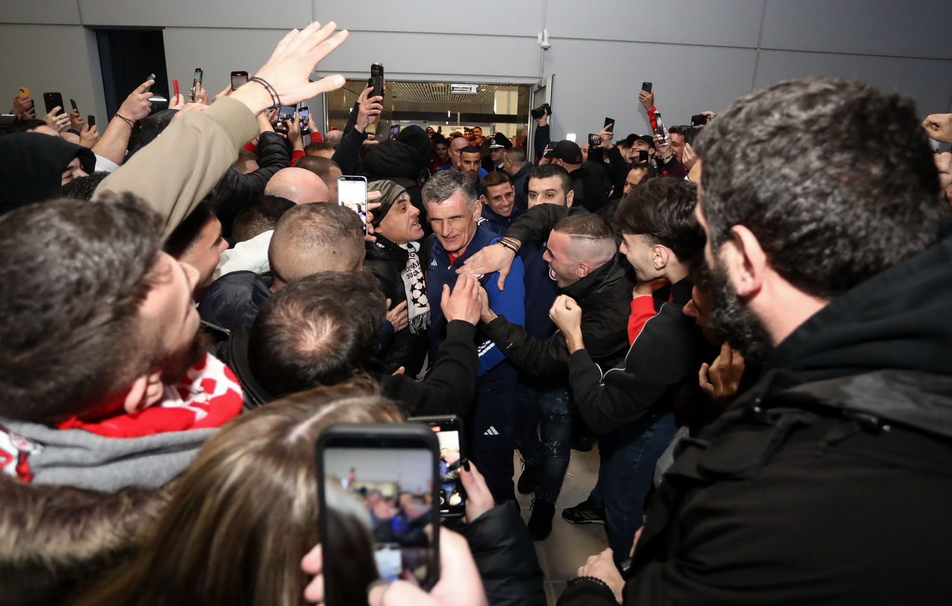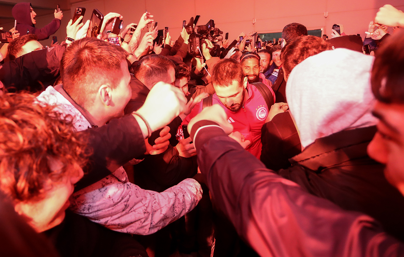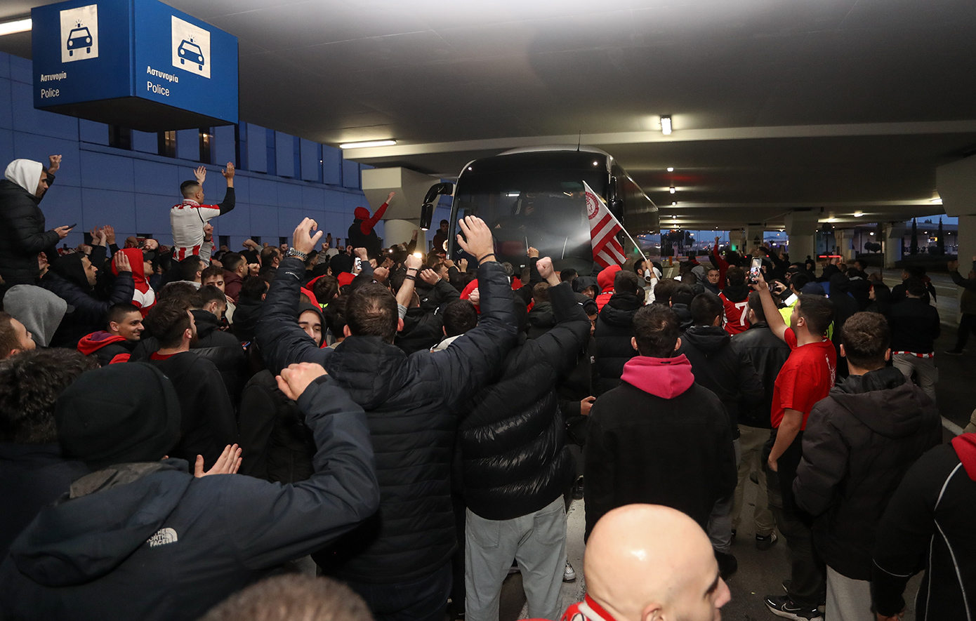 Μόλις έφτασε η αποστολή του Ολυμπιακού, οι οπαδοί άρχισαν να φωνάζουν συνθήματα και να χειροκροτούν τους παίκτες, ενώ πολλοί πλησίασαν τον προπονητή, Χοσέ Λουίς Μεντιλίμπαρ, για να αγγίξουν το έμβλημα της ομάδας πάνω στο μπουφάν του.