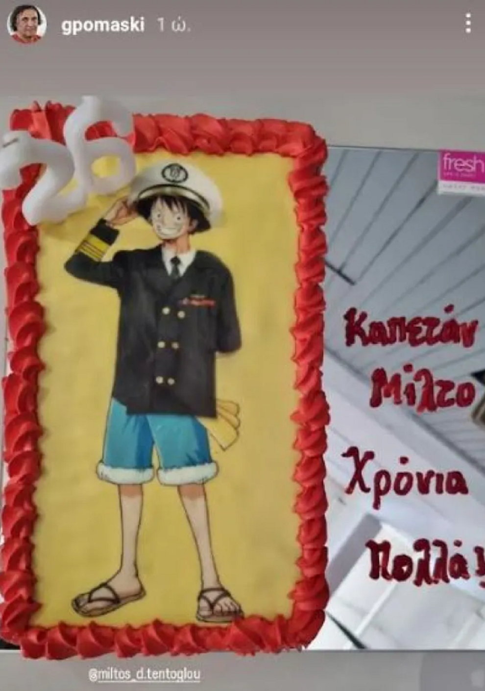 Συγκεκριμένα, σε story που έκανε στο Instagram, αποκάλυψε ότι πρόκειται για τούρτα εμπνευσμένη από το «One Piece», το οποίο λατρεύει ο Ολυμπιονίκης, σε βαθμό που είχε σχολίασε και ο δημιουργός του manga.