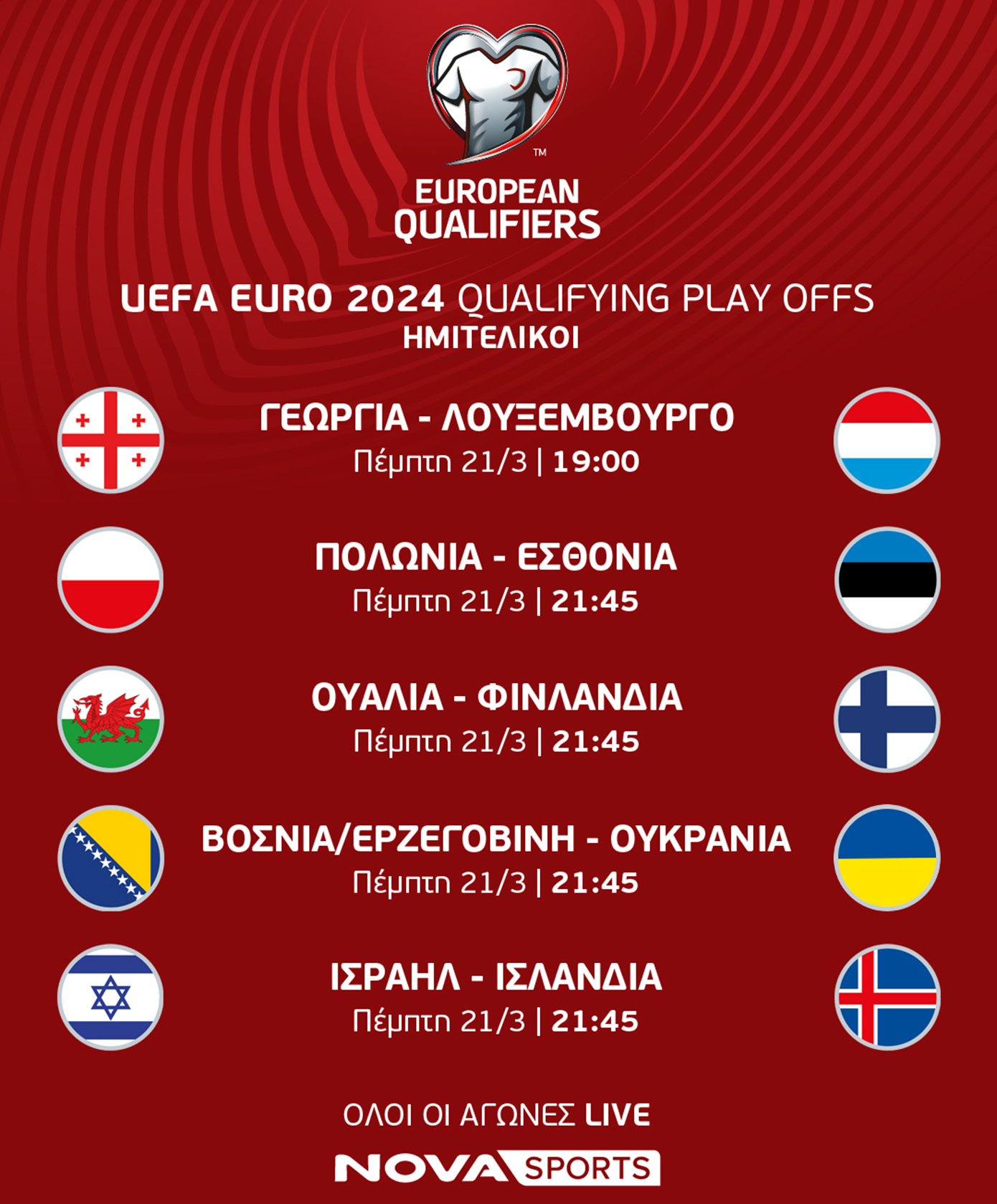Οι λάτρεις της «στρογγυλής θεάς» από τις 21 Μαρτίου έως τις 26 Μαρτίου θα έχουν την ευκαιρία να παρακολουθήσουν στο «γήπεδο» του Novasports, τα UEFA EURO 2024 Qualifying Play Offs με τη «γαλανόλευκη» να αγωνίζεται για την πρόκριση στα τελικά της διοργάνωσης του UEFA EURO 2024. Ο πρώτος αγώνας, κόντρα στο Καζακστάν, θα διεξαχθεί την Πέμπτη 21 Μαρτίου (21:45) στην “ΟPAP Arena” ενώ σε περίπτωση πρόκρισης θα ακολουθήσει την Τρίτη 26 Μαρτίου ο τελικός στην έδρα του νικητή του ζευγαριού Γεωργία- Λουξεμβούργο.