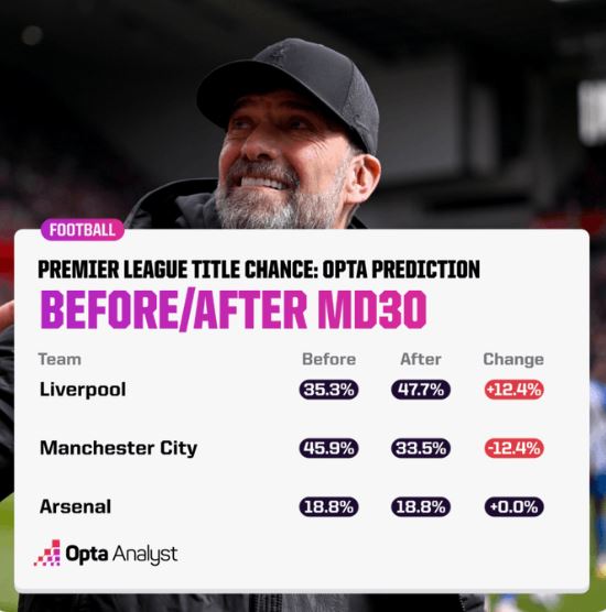 Είναι η πρώτη φορά που αυτή τη σεζόν η Opta έχει άλλη ομάδα εκτός της Μάντσεστερ Σίτι ως φαβορί σύμφωνα με τις 10.000 προσομοιώσεις στον «υπερυπολογιστή» της.