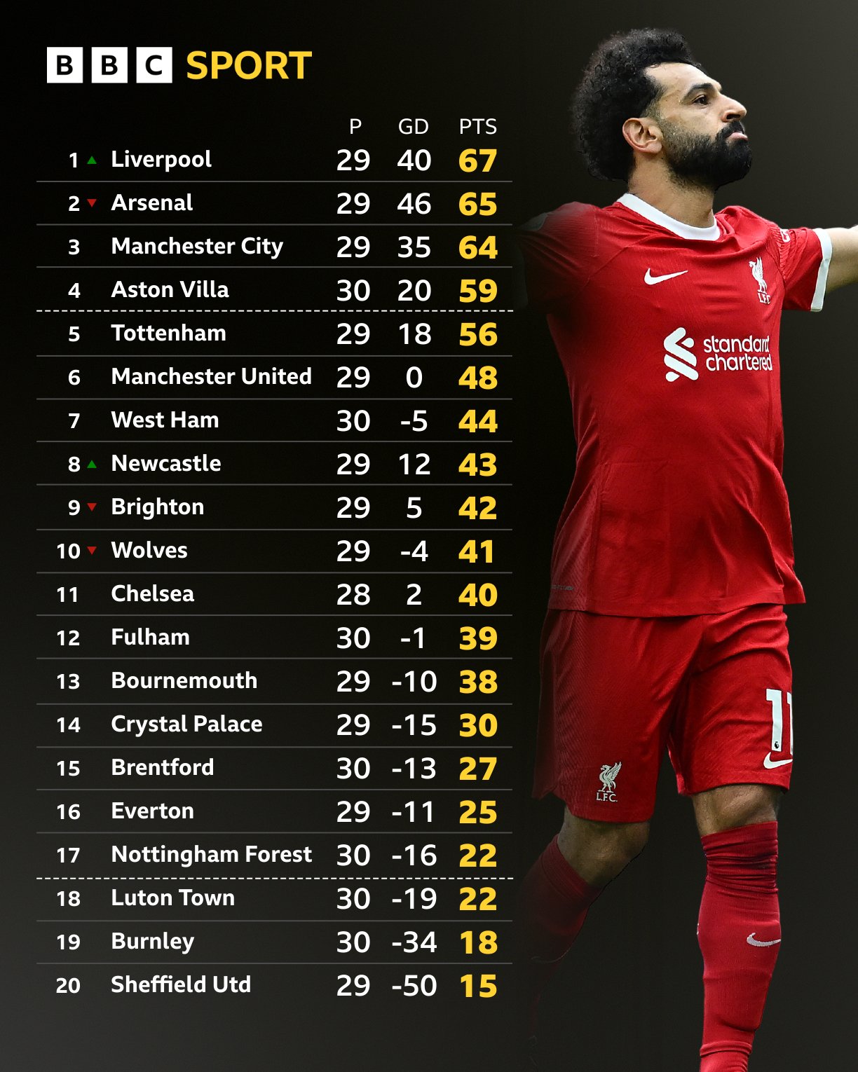Όσο για την πρωτοπόρο Λίβερπουλ, η ήττα με 3-1 από την Άρσεναλ στις 4 Φεβρουαρίου παραμένει η μοναδική της ήττα στο πρωτάθλημα σε 10 αγώνες μέχρι στιγμής το 2024.
