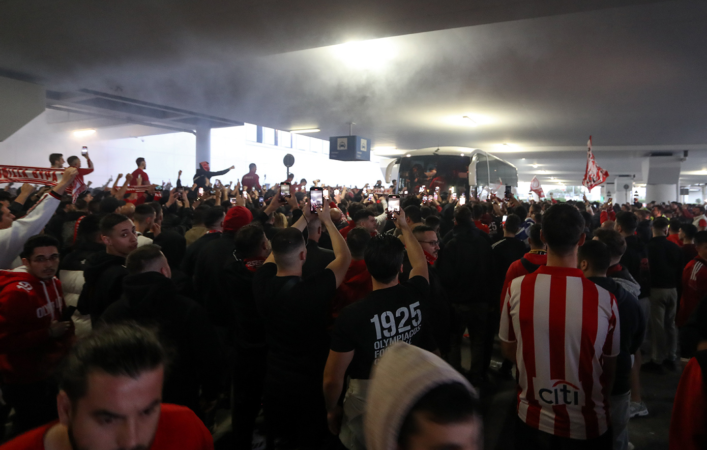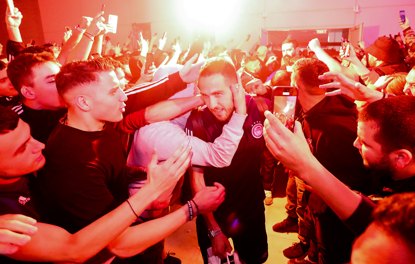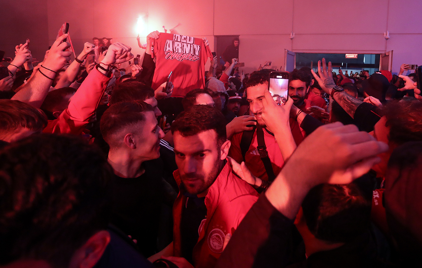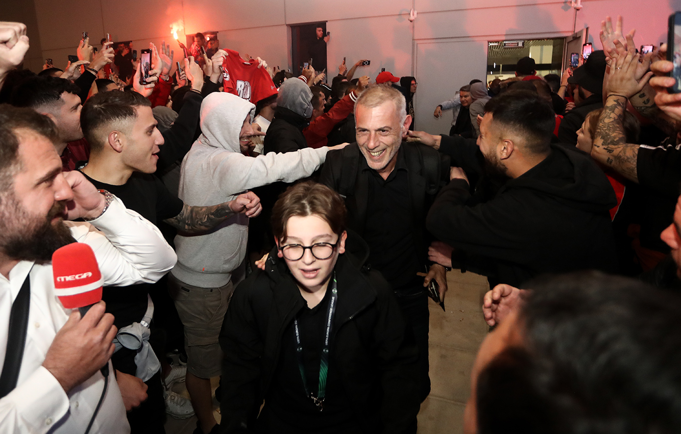 Μόλις έκαναν την εμφάνισή τους τα πρώτα άτομα της «ερυθρόλευκης» αποστολής έγινε χαμός, αφού οι οπαδοί άναψαν καπνογόνα, φώναζαν «Θρύλε σ’ αγαπώ! Φέρτε μας το ευρωπαϊκό!», ενώ ακολούθησαν ξεχωριστές αναφορές σε καθέναν από τους παίκτες που περνούσαν ανάμεσά τους.