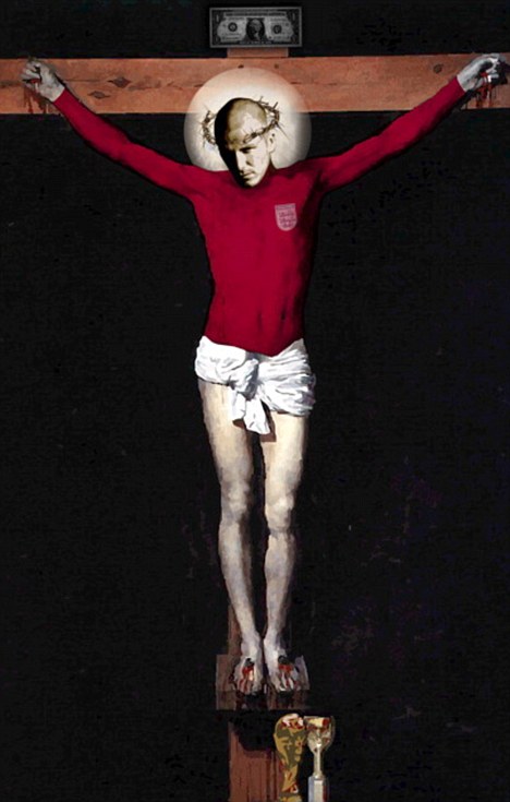 Ο ποδοσφαιριστής φορά την μπλούζα της εμφάνισης της Εθνικής Αγγλίας, ακάνθινο στεφάνι και αιμορραγεί στα χέρια και στα πόδια. Κάτω από τα πόδια του είναι ένα τρόπαιο του Μουντιάλ, αλλά και το «Ζιλ Ριμέ», που απονέμονταν στους ποδοσφαιριστές μέχρι το 1970. Πάνω από το κεφάλι του είναι ζωγραφισμένο ένα χαρτονόμισμα. Οι αντιδράσεις ήταν τόσο έντονες, που αναγκάστηκε να παρέμβει ακόμη και η αστυνομία στην υπόθεση, για να μιλήσουν με το δημιουργό του πίνακα.