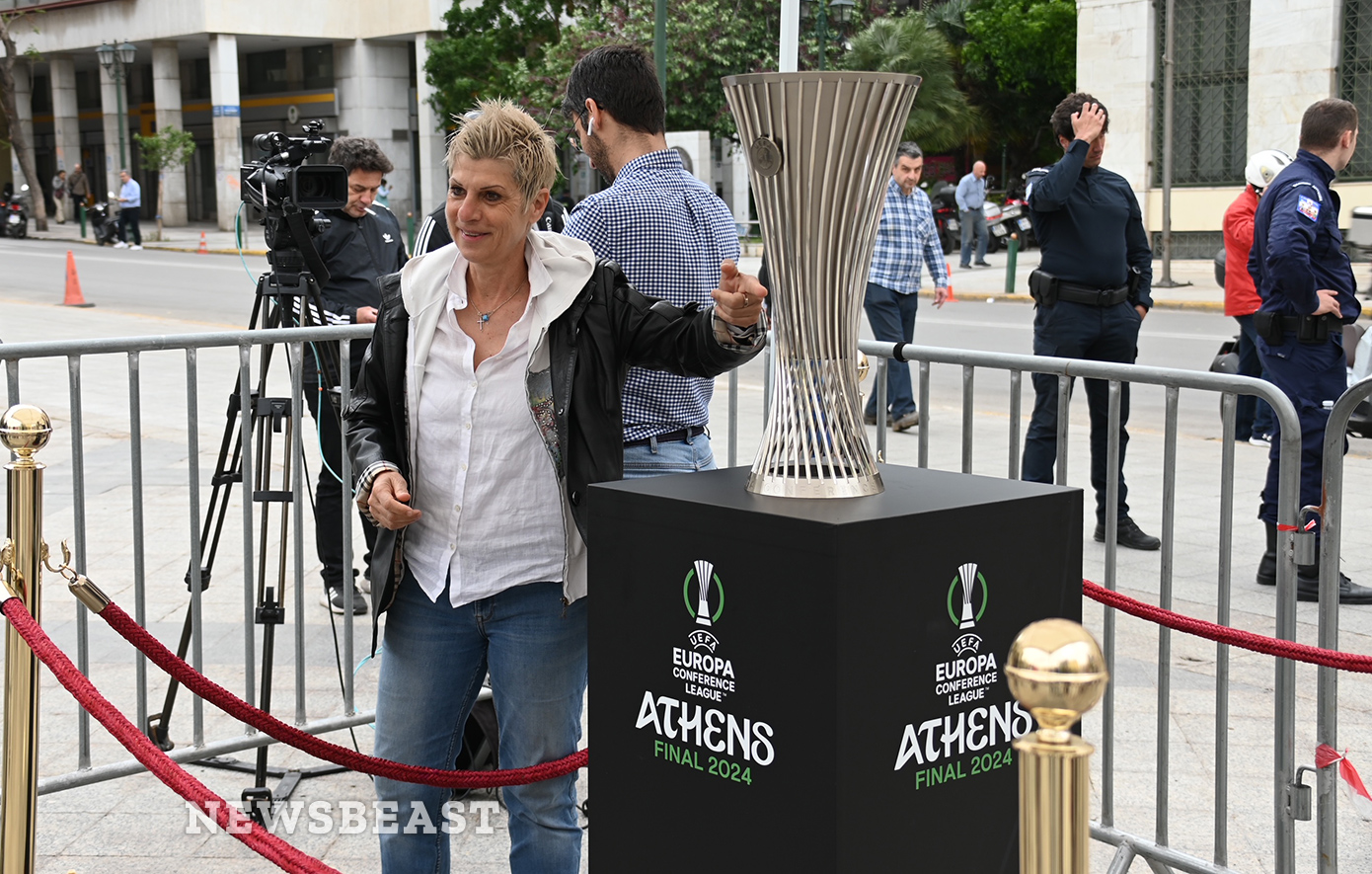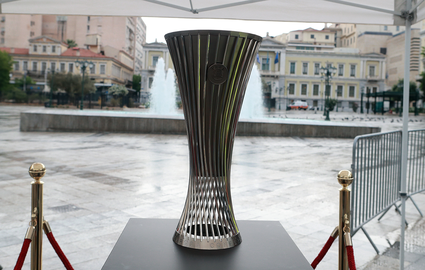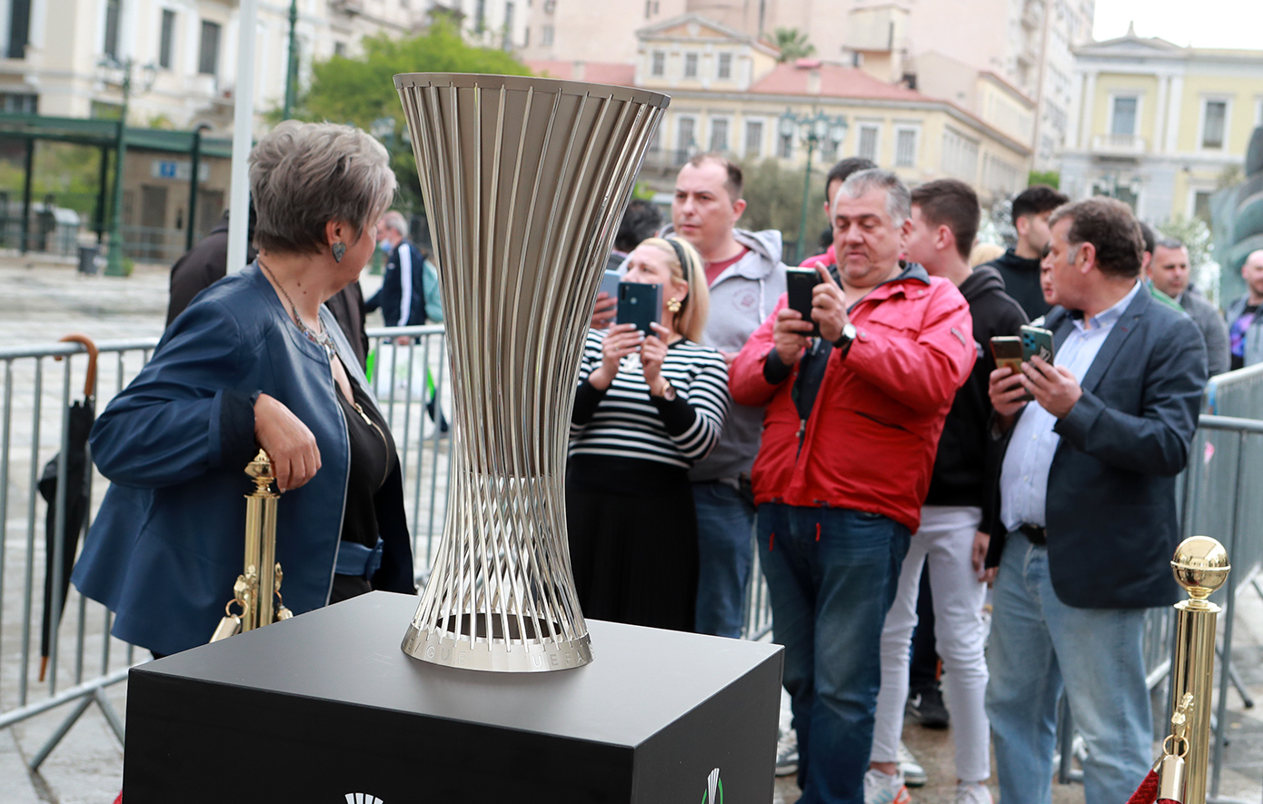 Το τρόπαιο του Europa Conference League το οποίο θα διεκδικήσει ο Ολυμπιακός με αντίπαλο την Φιορεντίνα στο OPAP Arena στις 29 Μαΐου, βρίσκεται στην πλατεία Κοτζιά από τις 09:00 το πρωί της Παρασκευής (10/05).
